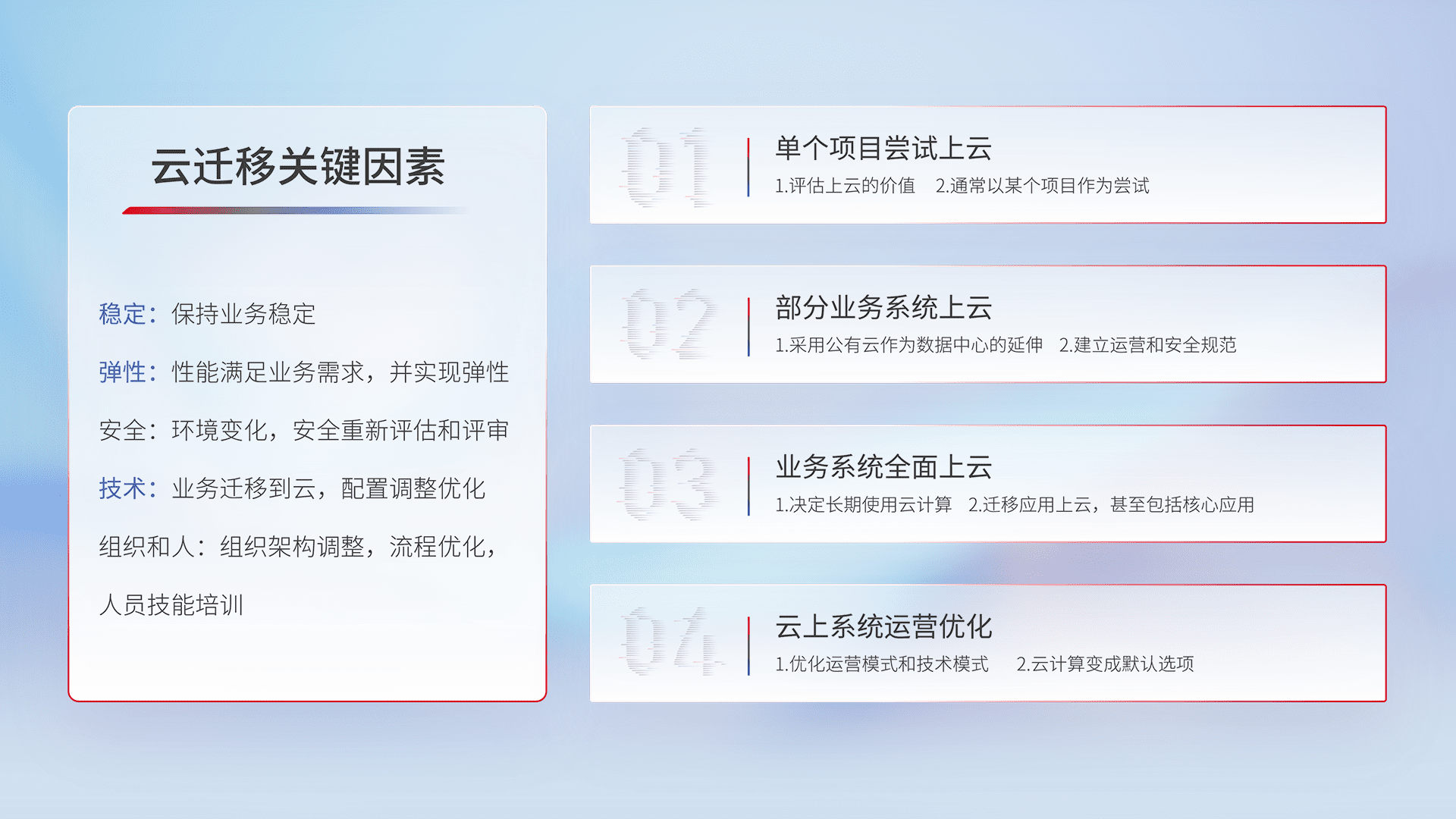 结合实际业务,,,从规划设计、、云平台选型、、、云原生改造、、、数据迁移、、集成交付,,,迁移全过程为客户识别最佳上云路径,,做好风险识别管理,,,设计网络架构、、、、身份权限、、、安全审计合规、、、、操作审计、、日志审计、、、监控告警策略、、多站点容灾设计等,,,对云上基础设施进行整体规划,,,提升IT治理水平,,,,以满足弹性、、、、高可用、、高性能的需求。。。。